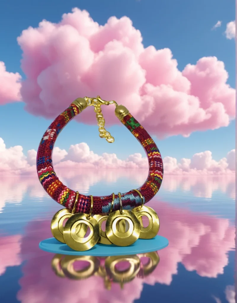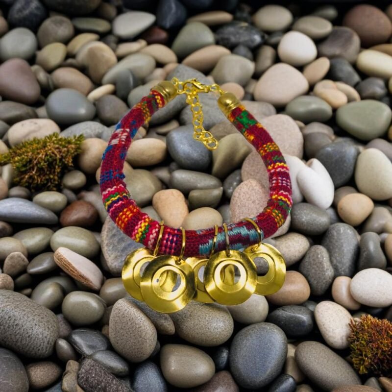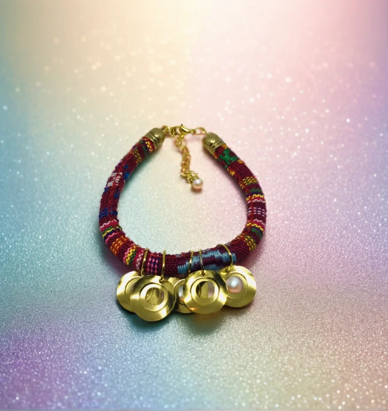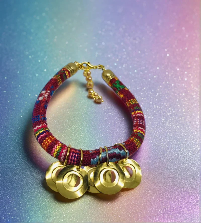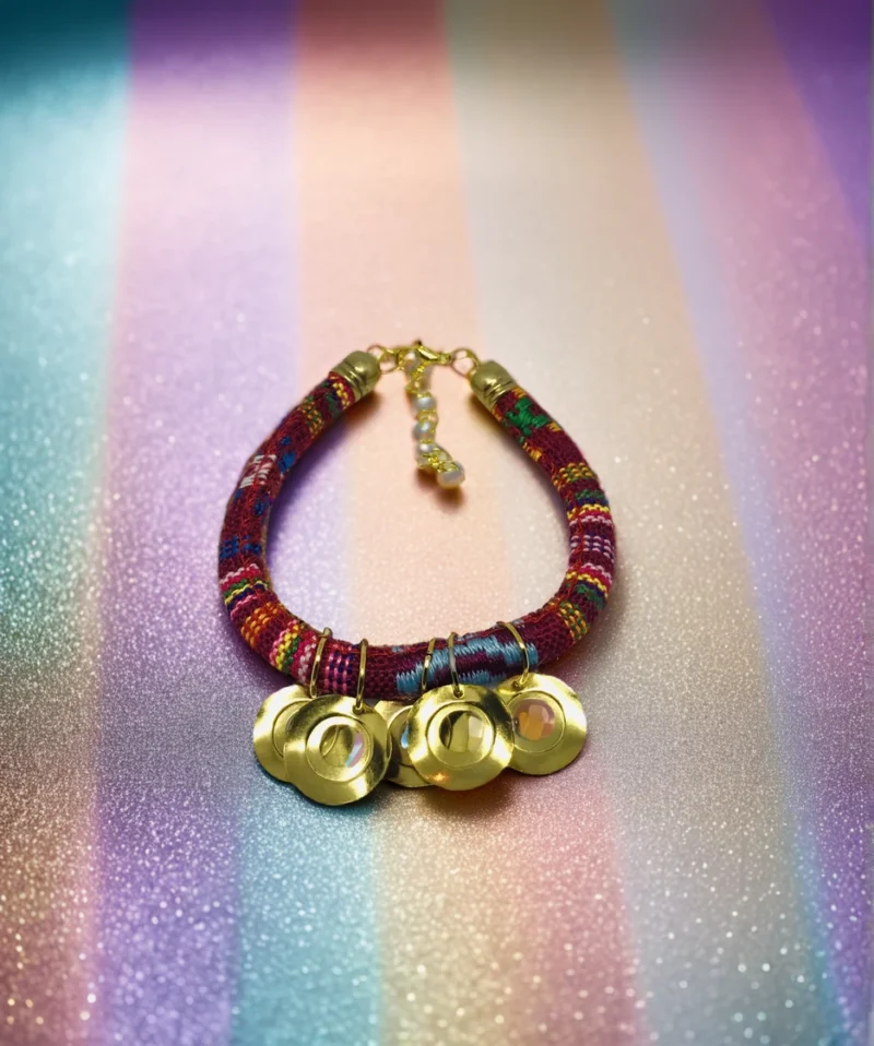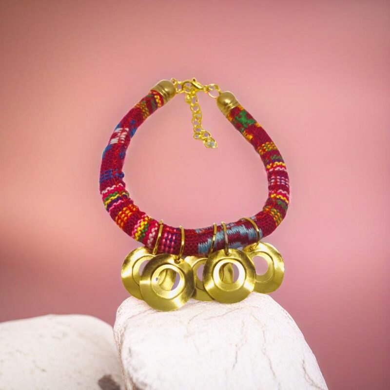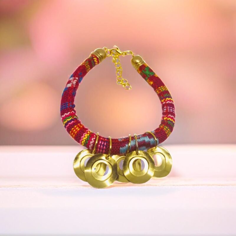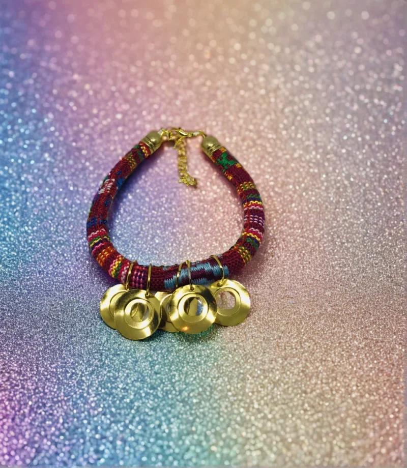 Bold Colored Cotton Handmade Spiritual Bracelet. Bright color cotton made with contrasting materials and coloring accented by golden tone coins.